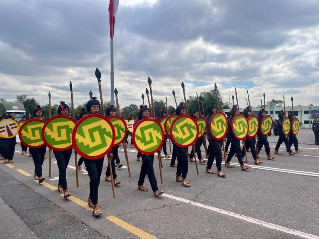 Durante el ensayo, el general Arturo Coronel Flores, Jefe del Estado Mayor Conjunto de la Defensa Nacional, pasó revista a los contingentes, exigiendo la perfección en cada movimiento.