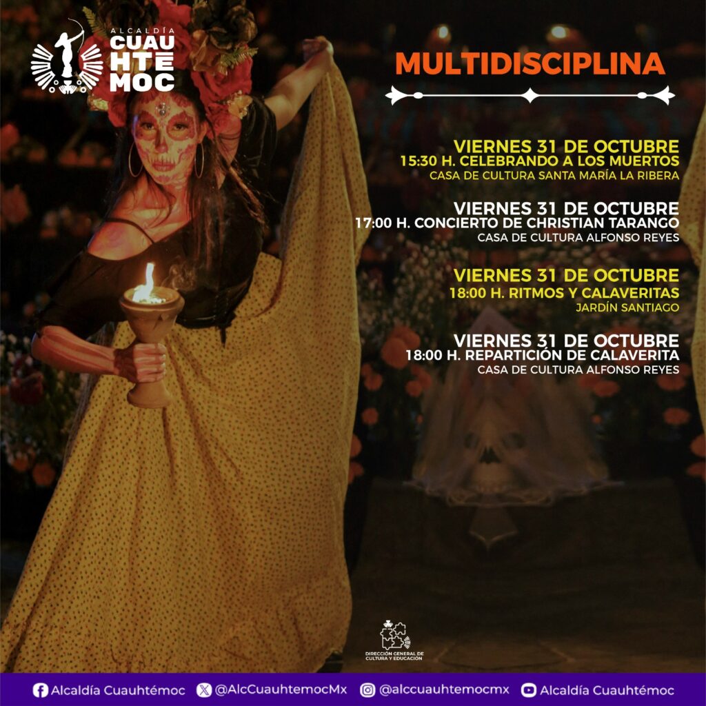 Además, habrá música, narraciones, reparto de calaveritas y presentaciones como el concierto de Christian Tarango, el 31 de octubre en la Casa de Cultura Alfonso Reyes, y el programa Ritmos y Calaveritas en el Jardín Santiago.