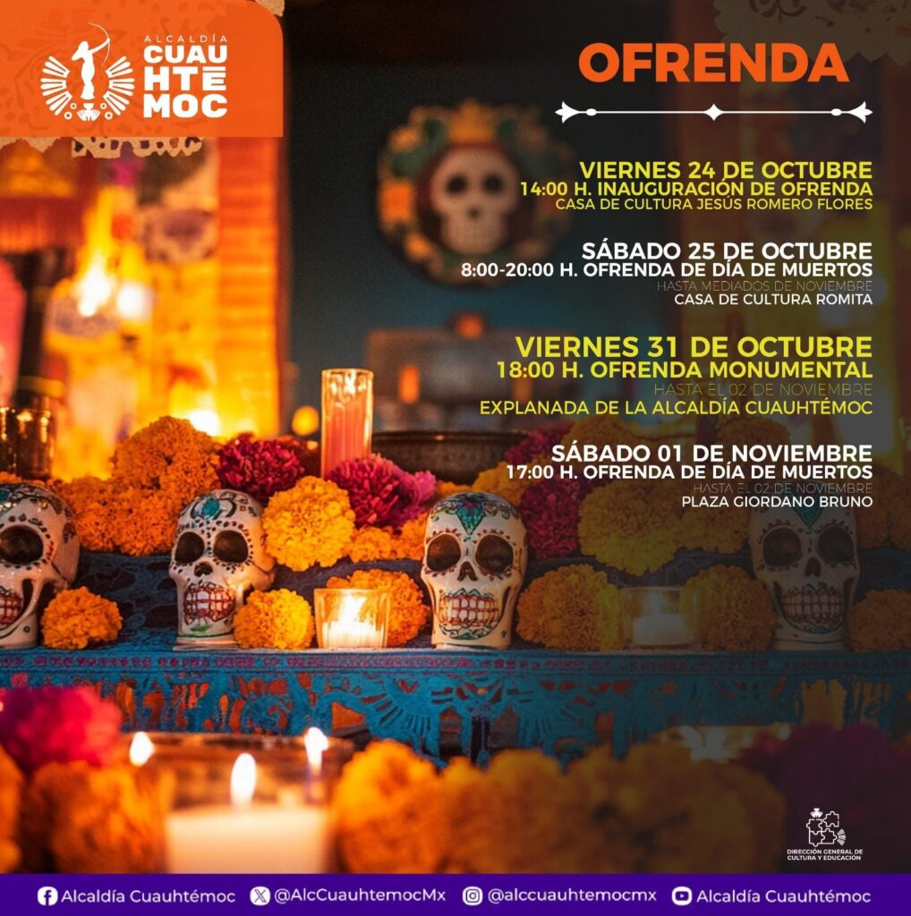 La Alcaldía Cuauhtémoc encabezada por Alessandra Rojo De la Vega, a través de la Dirección General de Cultura y Educación, anunció que durante octubre y los primeros días de noviembre, la demarcación se llenará de color, música, teatro y tradición con una amplia cartelera cultural para celebrar el Día de Muertos.