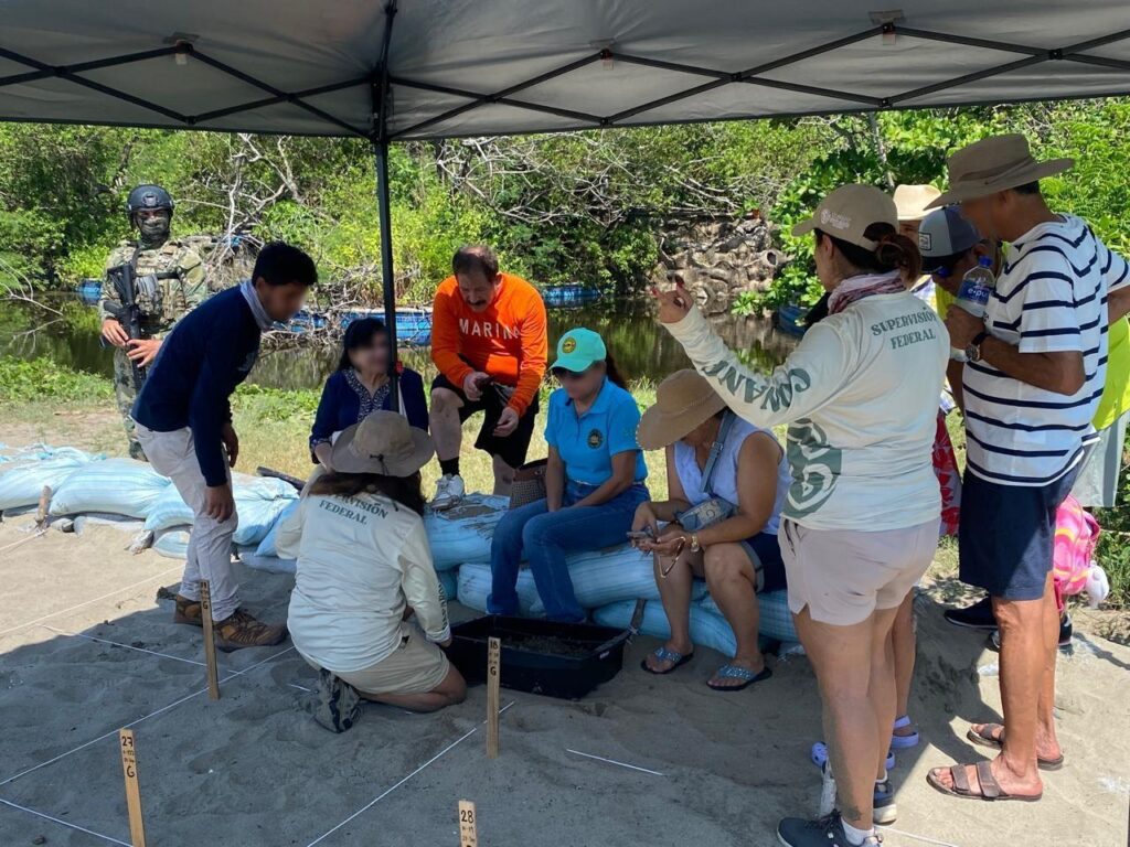 Durante esta actividad, los elementos de la Décima Octava Zona Naval, Marina resguardó el corral donde brigadistas comunitarios y voluntarios reubicaron los nidos para garantizar que las crías llegaran sanas al mar, demostrando la colaboración entre autoridades y ciudadanía en favor del medio ambiente.