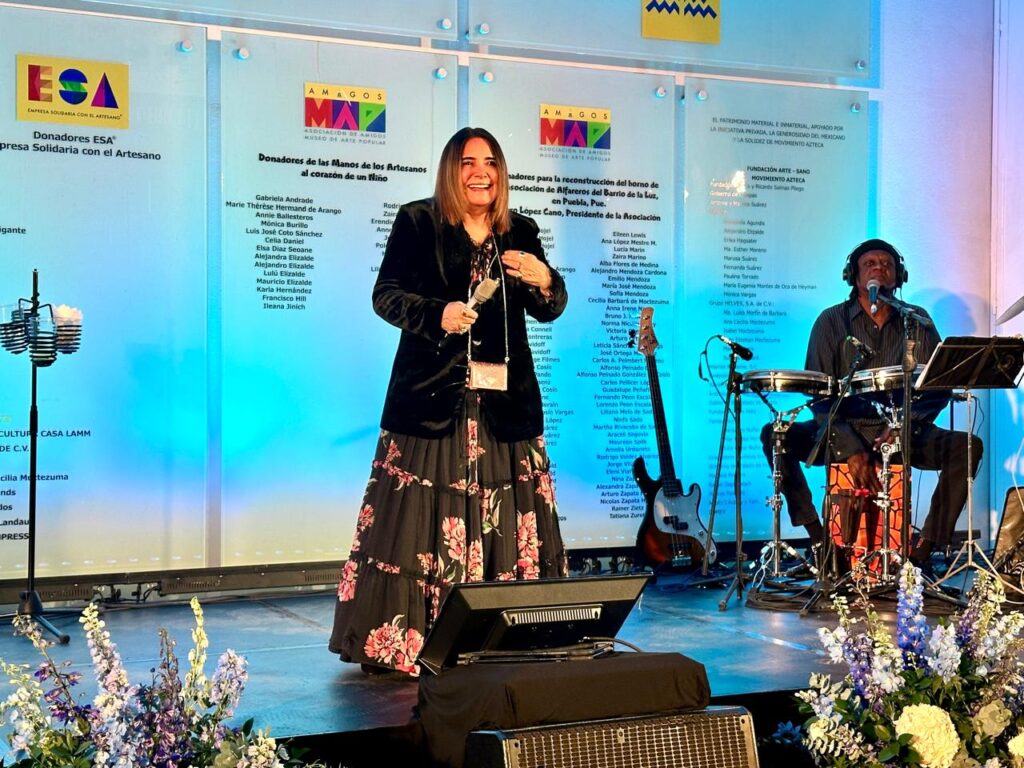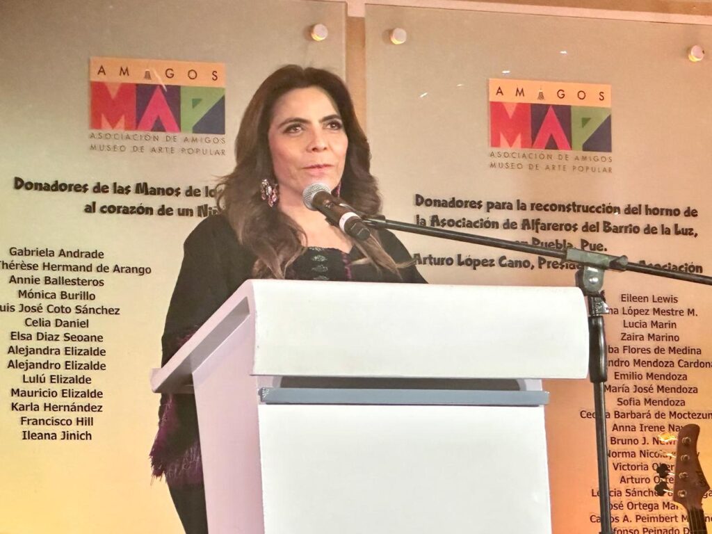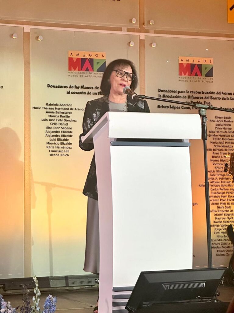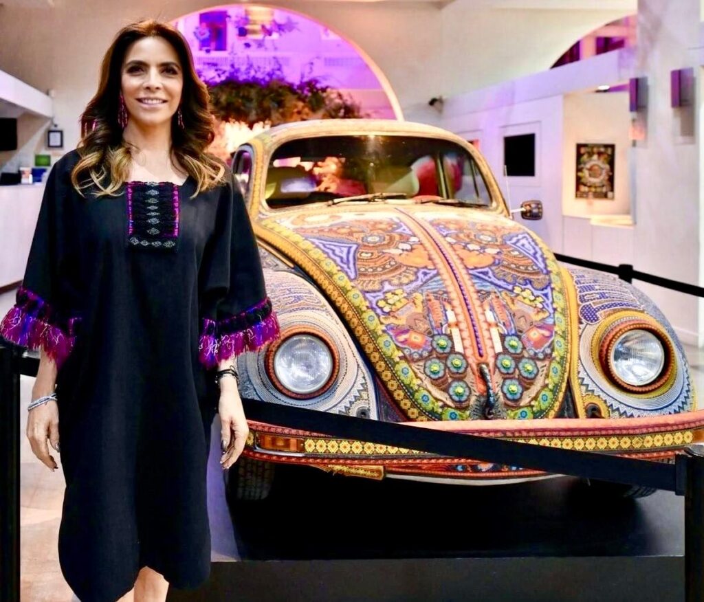 Bajo las luces cálidas del museo, la presidenta de la Asociación de Amigos del MAP, Mercedes Vigil Martínez, recordó cómo Marie Thérèse Hermand de Arango, cofundadora del recinto, impulsó la idea de convertir un vocho en un lienzo huichol.