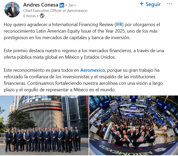 Aeroméxico fue distinguida por International Financing Review (IFR) con el premio Latin American Equity Issue of the Year 2025, uno de los reconocimientos más prestigiosos en los mercados de capitales y la banca de inversión, en reconocimiento a una de las operaciones financieras más relevantes de la región durante el último año.