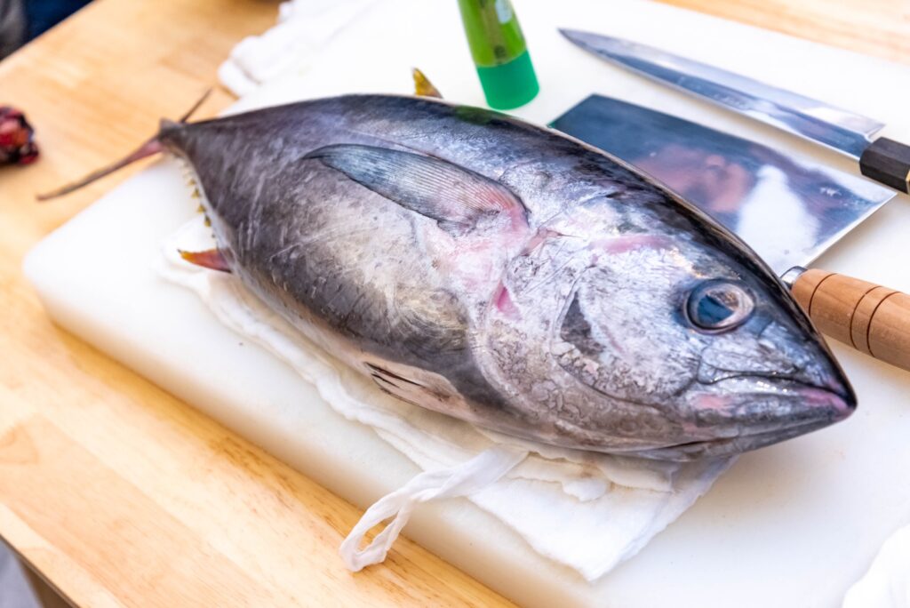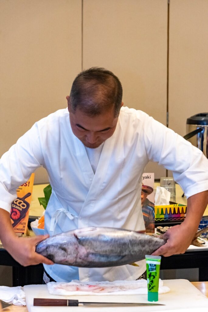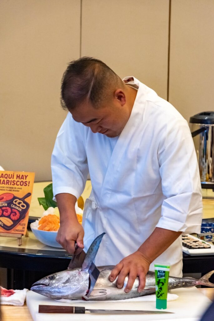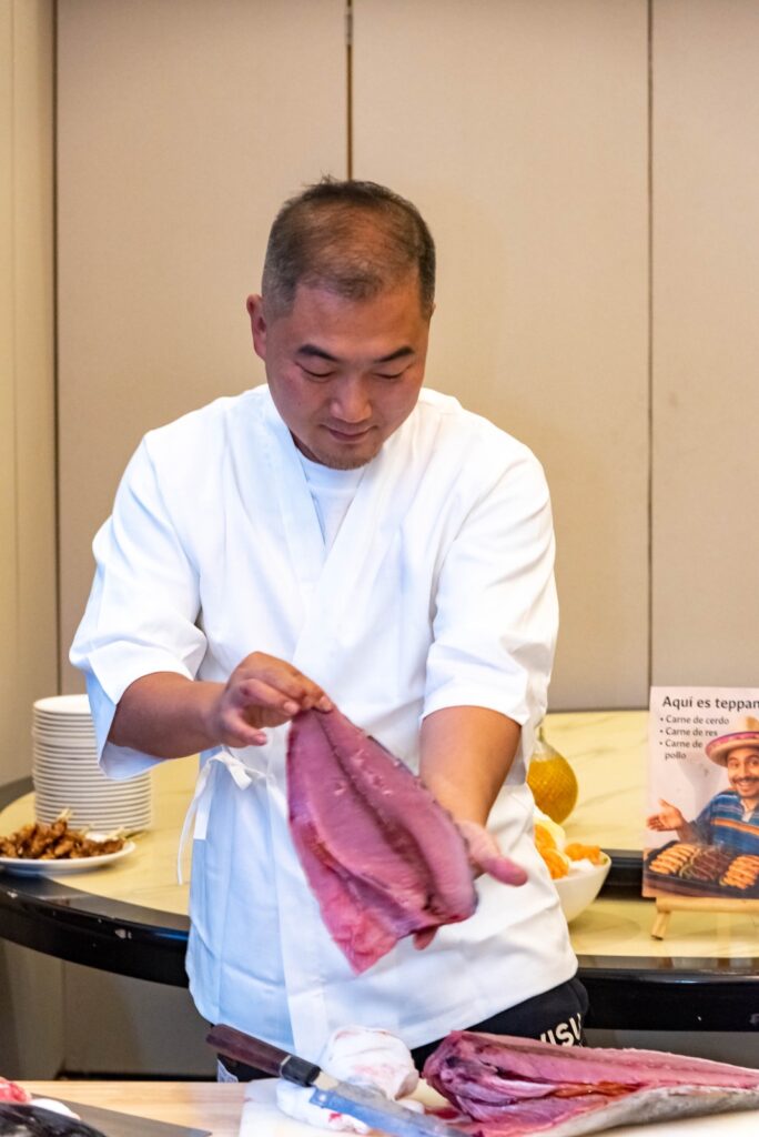 Uno de los momentos centrales de la jornada fue el ronqueo de atún, realizado por Kai, propietario de Viva Buffet, quien explicó el proceso tradicional de corte y presentó distintos tipos de piezas de atún de alta calidad, resaltando la técnica, frescura y el cuidado en el manejo del producto.