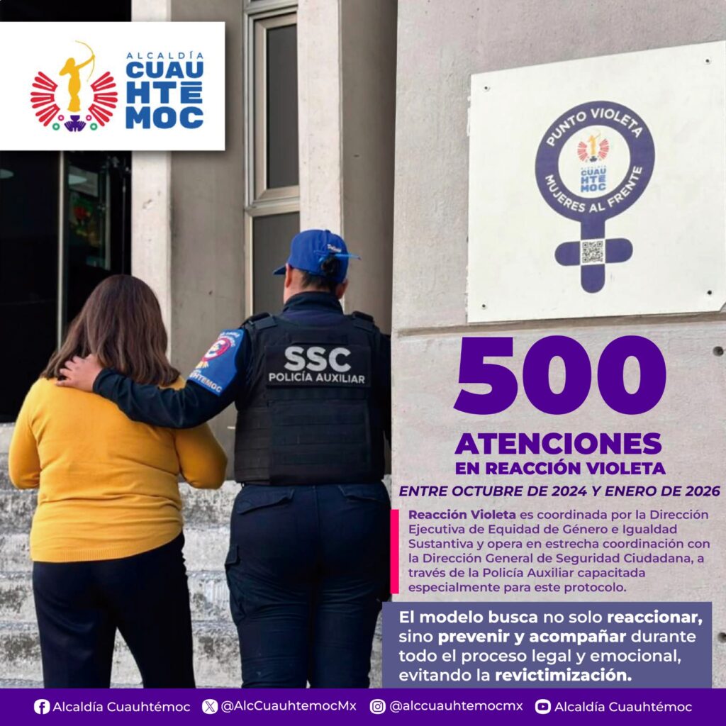 La Alcaldía Cuauhtémoc, encabezada por Alessandra Rojo de la Vega informó que entre el 15 de octubre de 2024 y el 3 de febrero de 2026, ha atendido a más de 500 mujeres en situación de violencia, mismas que han recibido acompañamiento directo del Gobierno local, esto se ha logrado a través de ‘Reacción Violeta’, un mecanismo interdisciplinario diseñado para brindar atención inmediata y seguimiento integral a mujeres y niñas.