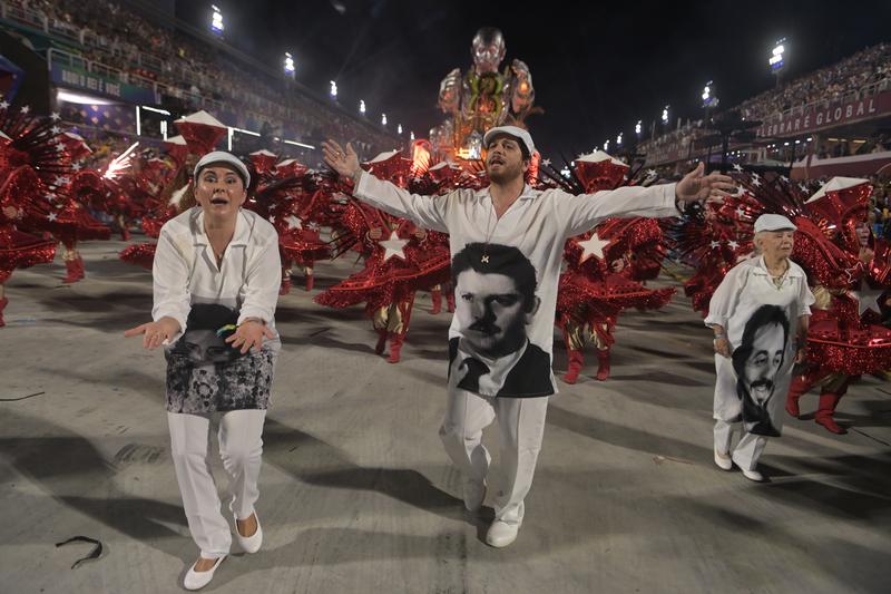 Carros alegóricos gigantescos mostraban escenas de fábricas, barrios obreros y plazas populares, mientras cientos de bailarines vestían trajes que mezclaban símbolos del nordeste brasileño con colores intensos de rojo y dorado.