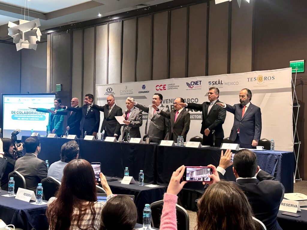 Durante el acto, encabezado por José Medina Mora Icaza, presiente del Consejo Coordinador Empresarial (CCE); Juan José Sierra Álvarez, presidente nacional de Coparmex; Ignacio Alarcón de CANIRAC; Héctor Flores, presidente de la Comisión de Turismo de Coparmex, destacó que esta actividad económica es uno de los principales motores del crecimiento nacional al generar millones de empleos, atraer inversiones y fortalecer a las comunidades.