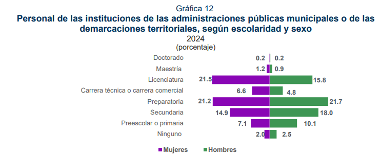 También, este instrumento de medición del INEGI, reveló que las y los servidores públicos que forman parte del personal de las presidencias municipales sólo el 21.5% de las mujeres y 15.8% de los hombres cuentan con una licenciatura, el 21 % de hombres y mujeres sólo cuentan con preparatoria, el 14.9% de las mujeres y 18.0% de los hombres cuentan únicamente con la secundaria y 7,0% de las mujeres y 10% de los hombres tienen en su historial académico únicamente la primaria, lo que significa que hay poca profesionalización de los servidores públicos a nivel municipal.