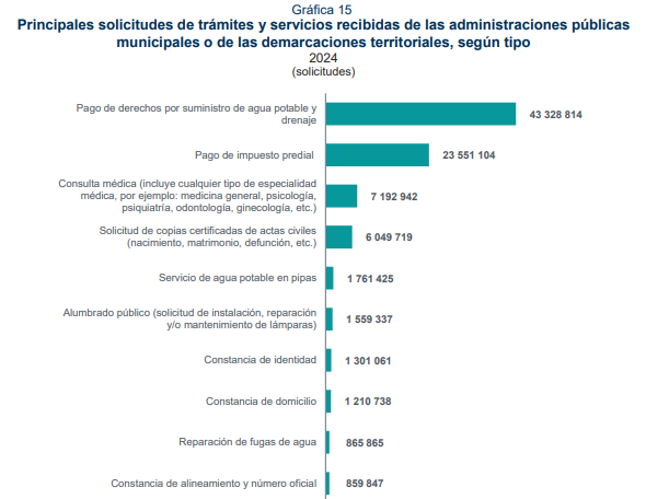 Respecto al tema de Gobierno Digital o digitalización de los servicios a en las demarcaciones territoriales, las principales solicitudes de trámites y servicios que requieren los ciudadanos son: En primer lugar el pago de suministros de agua potable, seguido de pago de impuesto de predial, consultas médicas, solicitudes de copias certificadas de actas de nacimiento y servicio de agua potable en pipas.