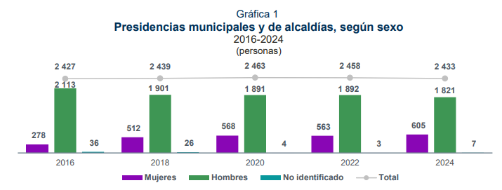 El Instituto Nacional de Estadística y Geografía (INEGI) dio a conocer en conferencia de prensa los resultados del Censo Nacional de Gobiernos Municipales y Demarcaciones Territoriales de la Ciudad de México (CNGMD) 2025, en donde se destaca el incremento de mujeres en la titularidades de las Presidencias municipales, al cierre de 2024, de 2 mil 433 municipios censados, 605 (24.9 %) eran mujeres y 1,821 (74.8 %) eran hombres, lo que representó un aumento del 8% en comparación con el 2022.